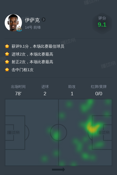 除了攻击端的表现,伊萨克在比赛中的身体对抗也非常出色。他共进行了7次地面争抢,成功率是2次,这显示了他在对抗中的坚决和果断。同时,他在空中争顶也有两次成功,展现了全面的身体素质和技术能力。